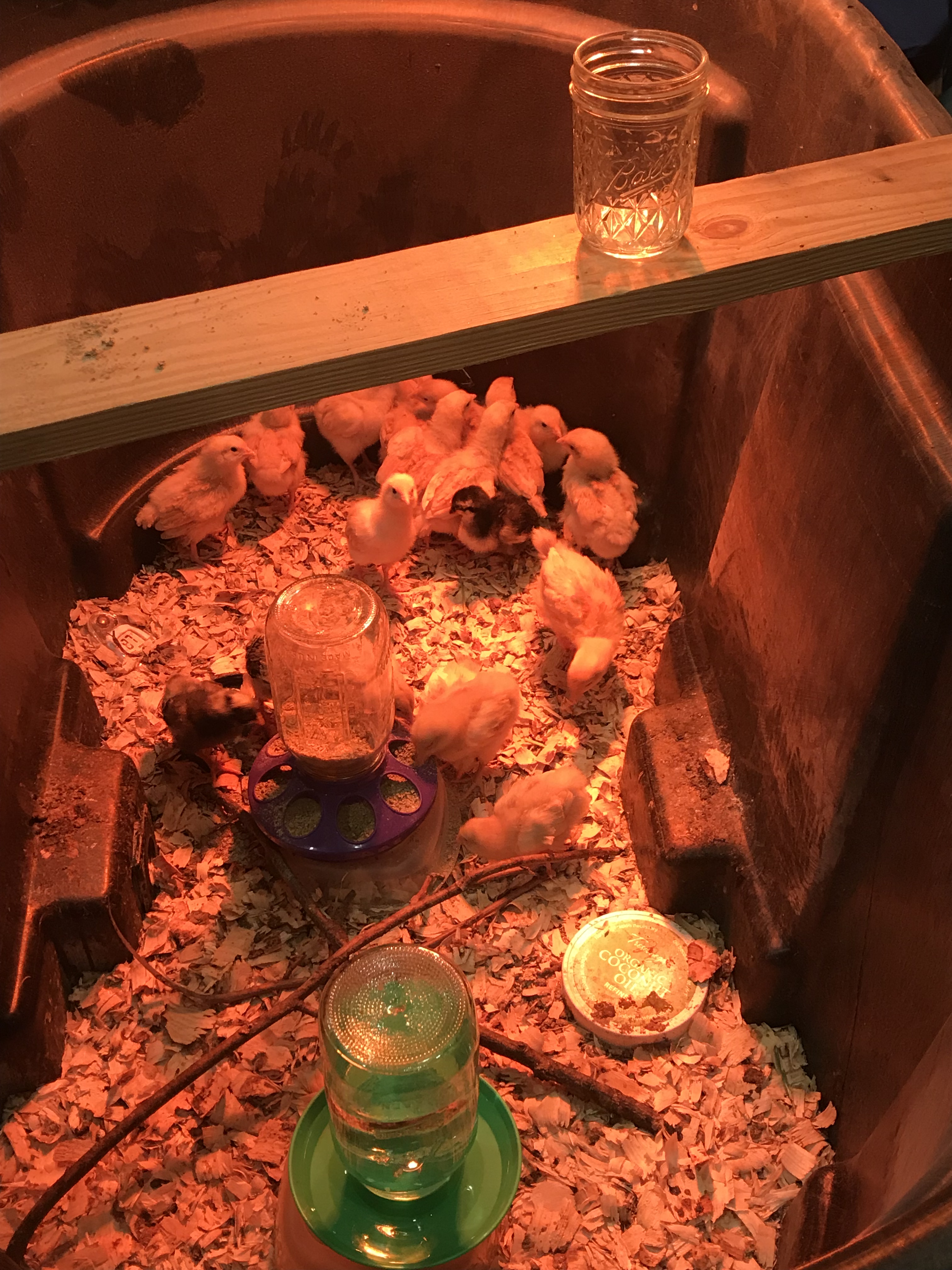 Now, you probably know this already, but three chickens is not much of a freezer full. So, as providence would have it, right around time of my failed hatching, one of my local TSC stores was expecting a huge batch of peeps to come in and just happened to clearance out all of their week or so old chicks, including a huge lot of buff orphingtons (SERIOUSLY, $1 for confirmed pullets as well as the mixed gender tub, who can say no!?!). Have you ever tried to sneak 15 peeps into your house with your spouse home? Its not easy, let me tell you. However, my husband is quite wonderful and once he accepts my crazy ideas, his normal response is “in for a penny, in for a pound” and we double whatever my original plan is.