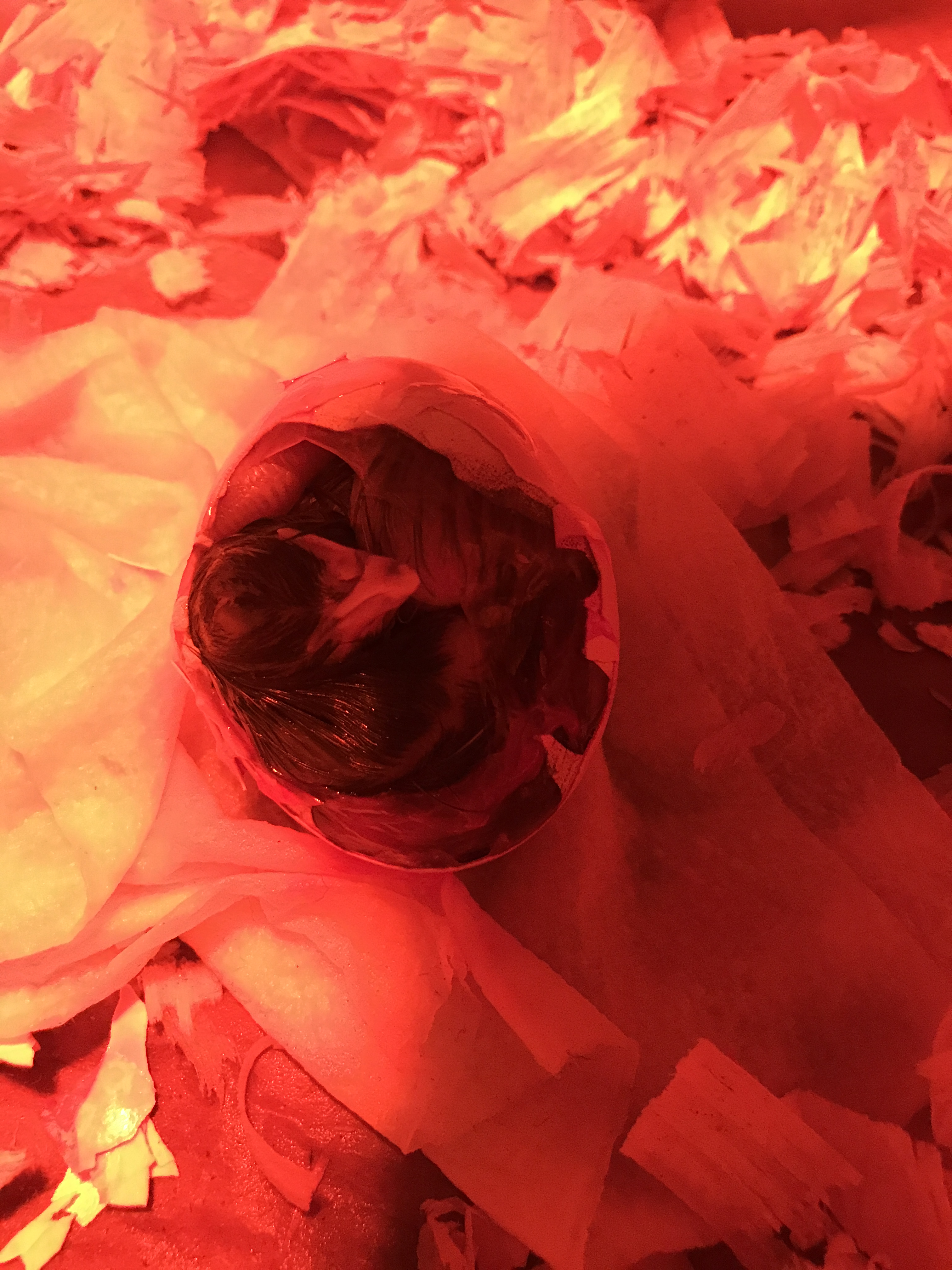 One day, I had a pipped shell, and the next day I went to check and saw no pipped shell and no babies. Odd. On day three, I had another chick about 1/3 of the way hatched. Now is a good time to explain that during the entire broody process, I had one rainbow that will not leave the nest box. She doesn’t want to sit on eggs, she just paces or walks on top of the broody. She is not my favorite. So while I was in the coop watching the egg hatch for a second, the mom was pecking at the egg (helping I guess?); along came both my rainbow chickens to peck as well. And then one of them simply picked up the egg to take off with it! Evil, evil cannibals. Don’t worry, this story has a happy ending. After retrieving the egg from the chicken and the blood that was almost spurting out of it with a screaming chick inside, I kicked all the chickens but the broody from the coop and into the run and gave the broody her egg back. However, she also started to peck at it viciously. So executive decision was made, these hens don’t get babies. I really wanted to have a hen raise the babies so I didn’t have to do the work, but c’est la vie. I had already planned to add my yearling hens to the freezer this fall, but this seals the deal. So I put the hatching chick way underneath the broody and ran inside to set up a brood box with some heat. Which at that time what I had was a cardboard box from Chewy.com (great boxes, btw). And went back out to collect the now mostly hatched chick and one other that had pipped to hatch inside.