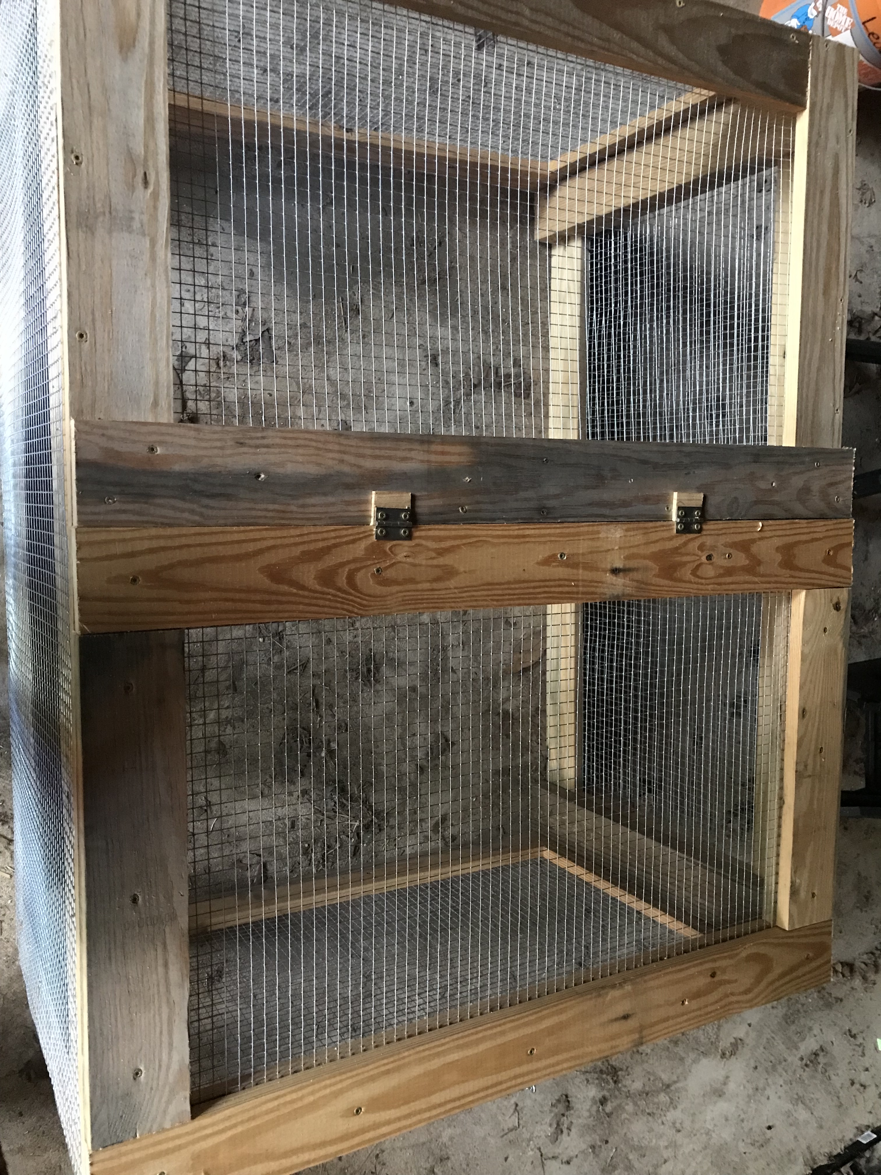 Once the frame was built and the hardware cloth installed, we created a half door on the top of the brooder (thank you Lumnah Acres for inspiration!). By making half of the roof a solid piece attached to the cube, we really added stability as well as not having to piece together the hardware cloth over a huge top frame . Add in some hinges and a hook and eye closure, and I feel comfortable that something is at least going to have to work for a peep meal!