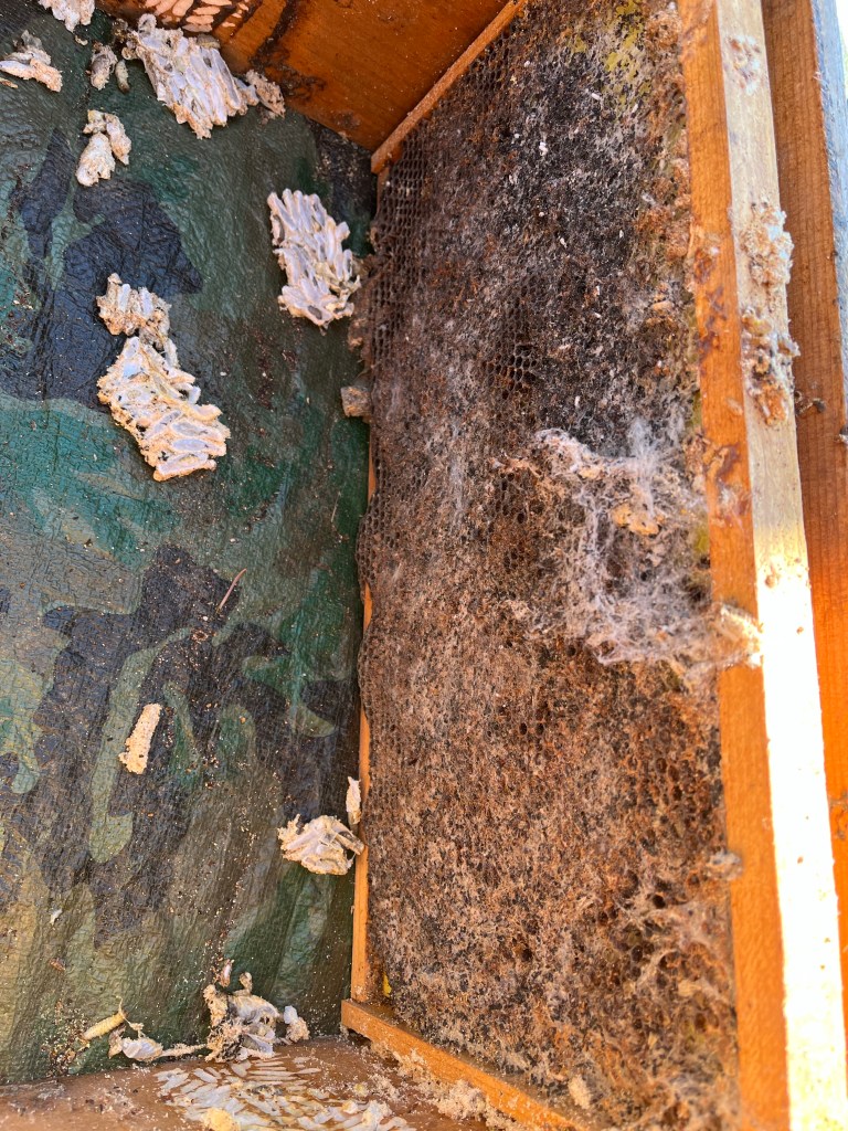 My bees were gone, the moths had made webs everywhere, and the larvae were demolishing my frames. The only up side was the hive next door pilfered whatever honey was left and got a boost right before winter. They’re mean as can be, but those wild bees are hardy!
